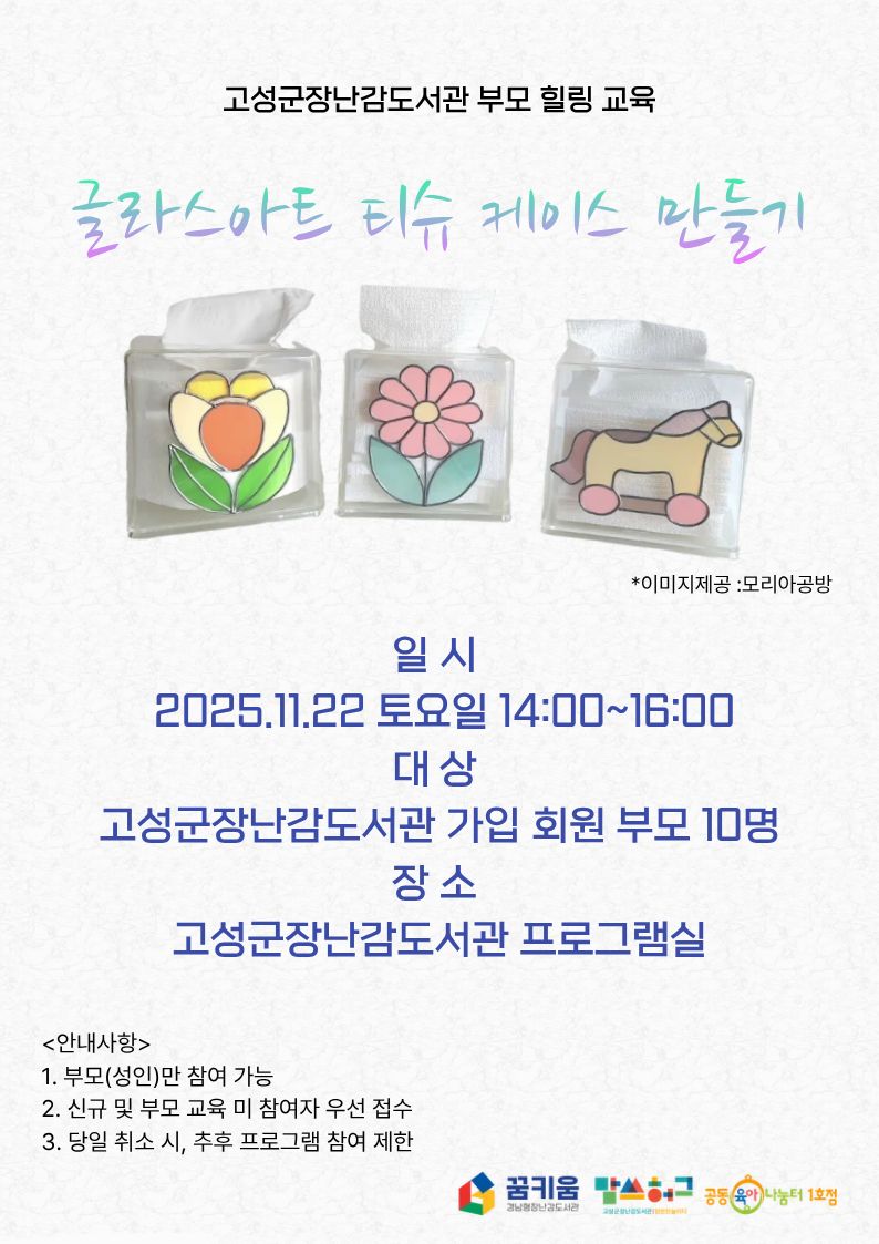 ■ 고성군장난감도서관 부모 힐링 교육 [글라스아트 티슈 케이스 만들기] 프로그램<<선정자 발표>> |